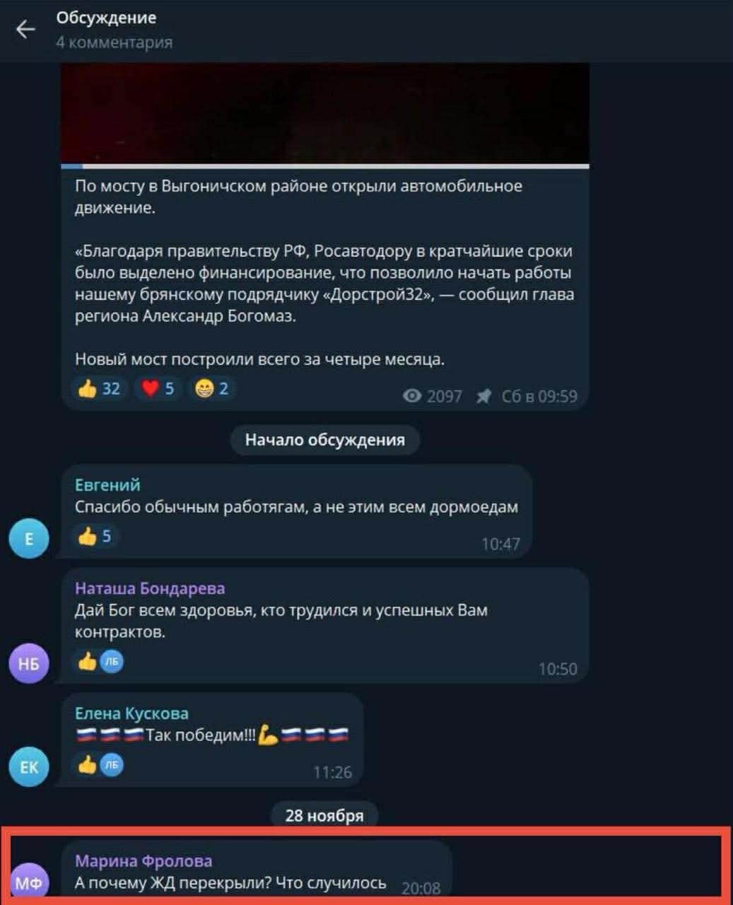 Россияне в Брянской области рассказывают о перекрытии железной дороги / Скриншоты