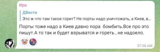 - "Порты тоже надо, а Киев давно пора бомбить. Все об этом пишут. А то так и будет взрываться и гореть, не надоело?"