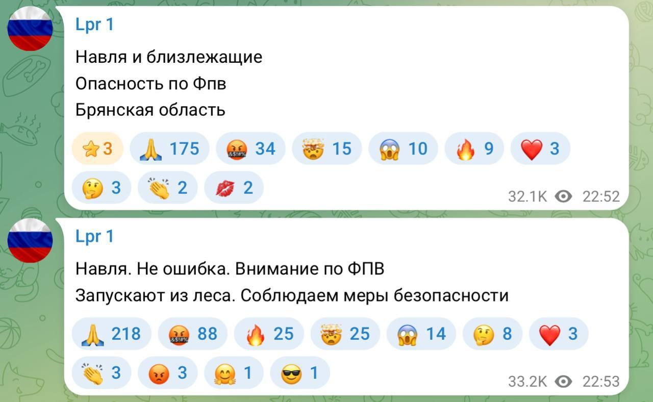Российские телеграм-каналы писали о том, что Навлю – поселок в Брянской области атаковали FPV-дроны. Отмечается, что их запускали из леса. Заметим, что этот населенный пункт расположен в 70 километрах от госграницы. Там размещена одна из крупнейших точек запуска российских "Шахедов" и баллистики.