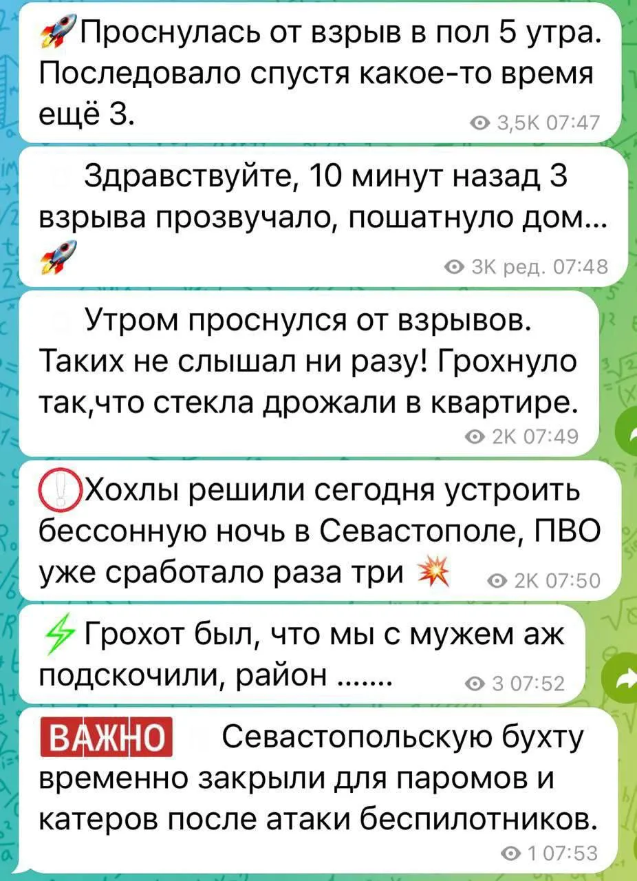 Поскольку жители Севастополя начали суетиться, то в пабликах очень быстро распространилась информация об отражении атаки дронов. Их якобы сбивали с помощью кораблей в Севастопольской бухте, сообщил "губернатор" Михаил Развожаев. Он призвал не беспокоиться и отметил, что в результате атаки не пострадал ни один объект. Прозвучало также традиционное "все под контролем".
