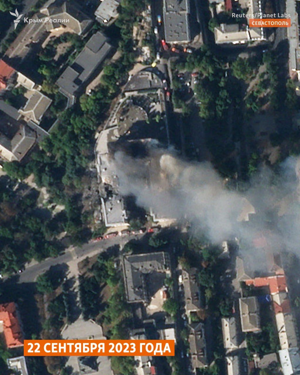 В Армении оппозиция объявила протесты против нынешнего правительства страны. В ходе митинга оппозиционеры "поздравили" Россию с уничтожением штаба Черноморского флота. От имени Национально-демократического полюса и всего народа Армении от всей души поздравляю Россию с уничтожением штаба Черноморского флота, После его слов армяне скандировали "Ура", "Слава Украине", "русский военный корабль" и т.п. Planet Labs показали, как выглядел штаб Черноморского флота России за день до удара (21 сентября) и после атаки (22 сентября). На фото видно, что в пятницу днем здание штаба было серьезно повреждено. Дым и разрушение видны из космоса. Чтобы сравнить, перетащите ползунок: Сил специальных операций сообщили, что в момент атаки на штаб в Севастополе там проходили совещания руководящего состава флота России. Начальник Главного управления разведки Украины Кирилл Буданов рассказал, что в результате удара погибли по меньшей мере 9 оккупантов, а еще 16 – получили ранения, в том числе генералы. Среди раненых: Количество пострадавших обычных военнослужащих, не являющихся работниками штаба, еще устанавливается. Это военные, которые несут службу, охрана, и так далее – они не входят в перечень, который я озвучил, Издание Sky News заявило, что Украина атаковала здание штаба ЯФ ракетами Storm Shadow. Такую информацию журналистам сообщили в Воздушных силах. Только что россияне заявили, что пожар в штабе Черноморского флота локализовали. То есть это означает, что здание горит уже более 9 часов. Журналисты Крым.Реалии "Показали фото, на котором видна ракета, поразившая штаб Черноморского флота России. Это опровергает версию российских властей обо всех сбитых ракетах, атаковавших сегодня Севастополь.