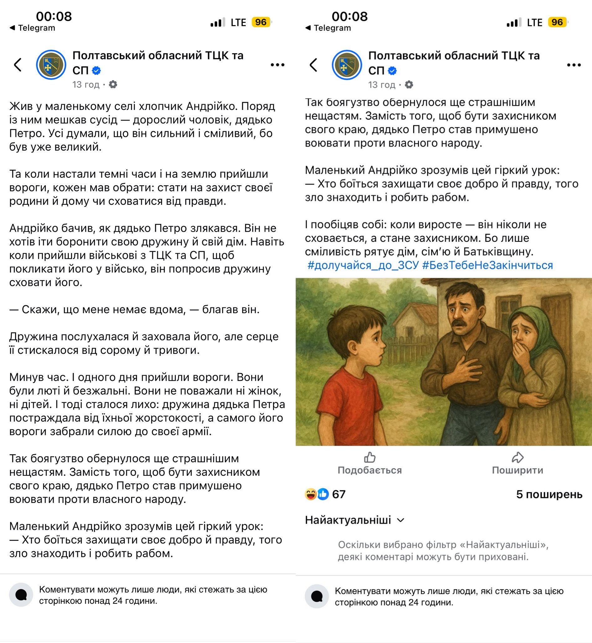 Интересный случай произошел со страницей Полтавского областного ТЦК и СП. В соцсети X публиковали скриншот сообщения в Facebook этого ТЦК со сгенерированной сказкой и иллюстрациями.