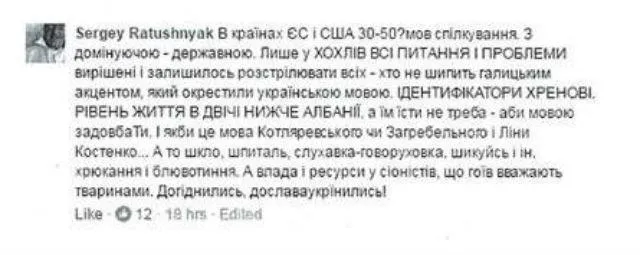 "Только у хохлов все вопросы и проблемы решены и осталось расстреливать всех, кто не шипит на галицком диалекте, который обозначили украинским языком", – писал экс-чиновник.