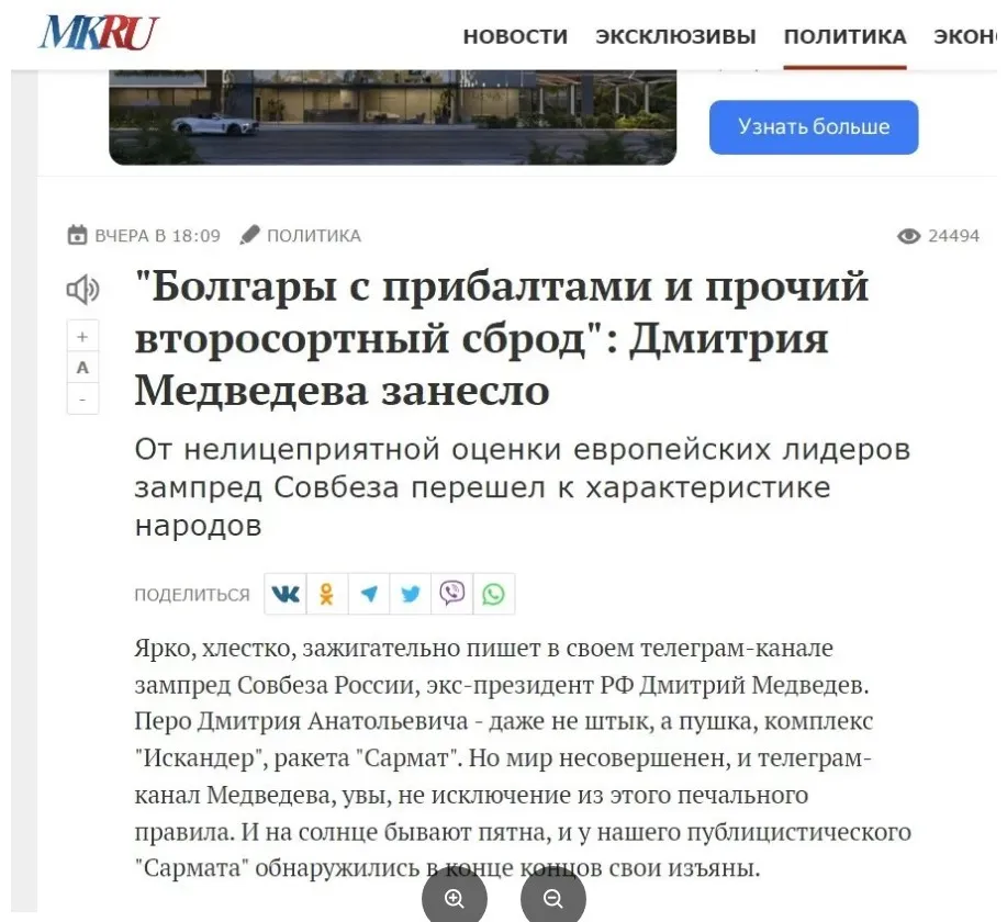 Как прокремлевское издание отреагировало на сумасшедший бред Медведева / Скриншот 24 Канала