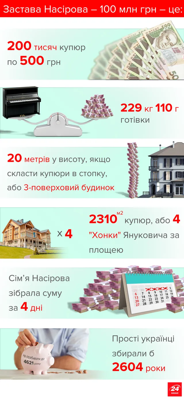 Семья Насирова собрала сумму в размере 100 млн грн за 4 дня (от решения Апелляционного суда). А вот простому украинцу с минималкой в 3200 пришлось бы собирать эти деньги 2604 года.