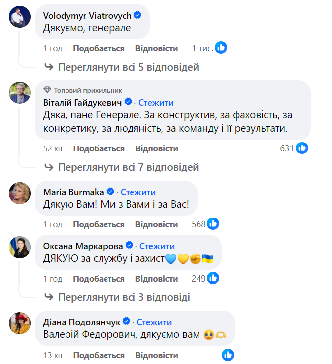 Десятки других известных украинских деятелей выразили свою благодарность Главнокомандующему. Большинство из них простые и лаконичные – они пишут только "Спасибо".