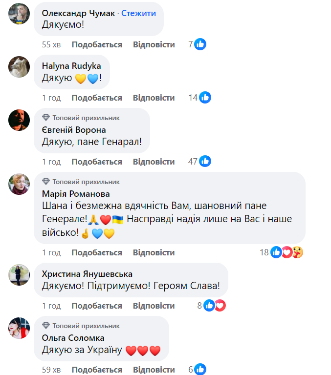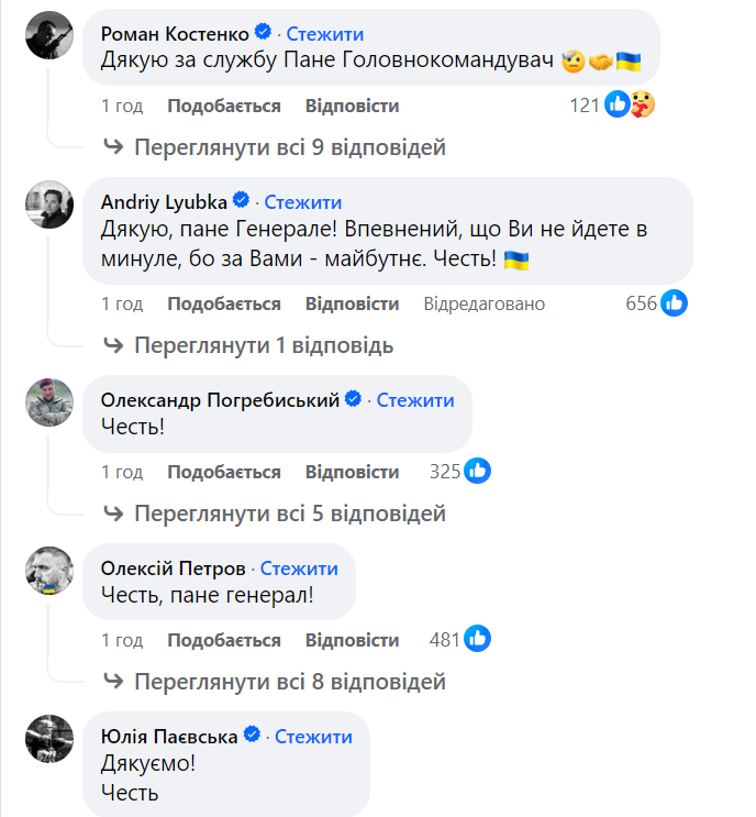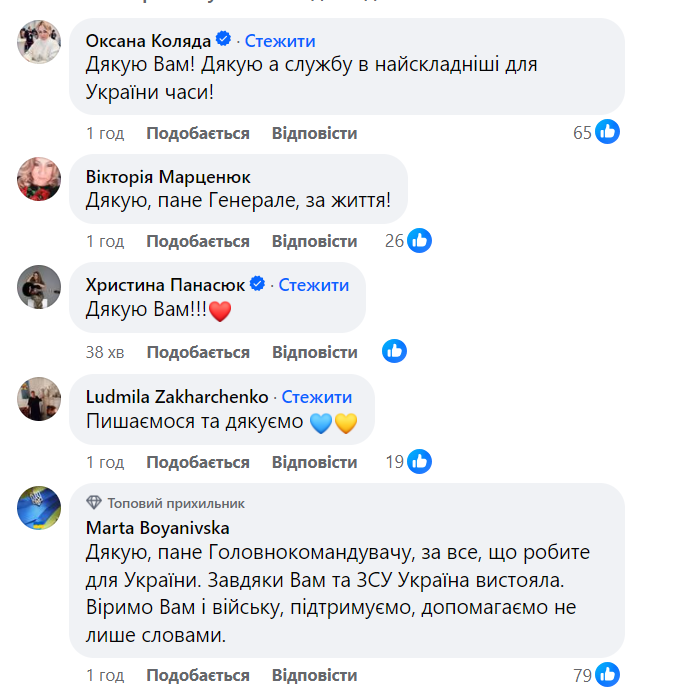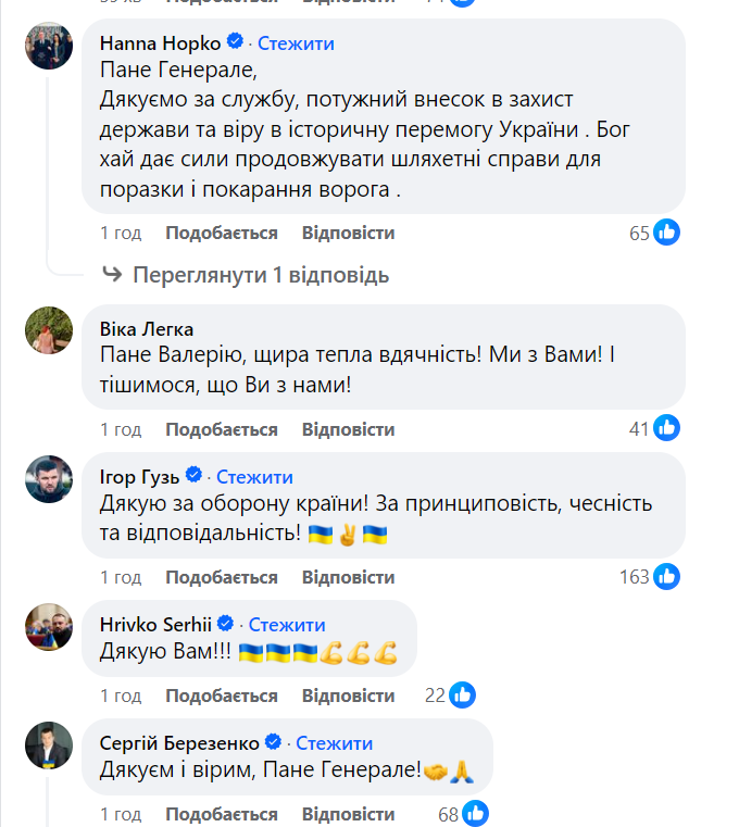 Конечно, особенно много благодарности под постом Валерия Залужного. Тысячи людей пришли написать, как они благодарны за эти два года, которые генерал оборонял страну от российских захватчиков.