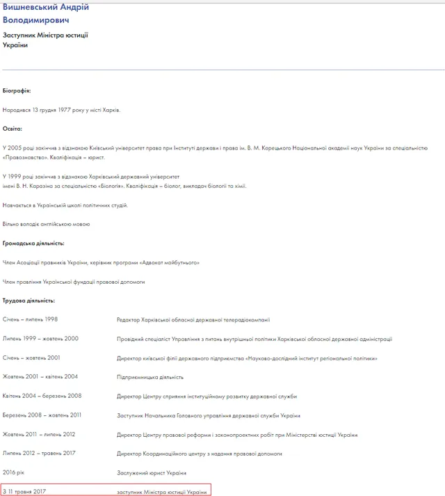 На сайте Минюста указано, что на должность заместителя министра Андрей Вишневский был назначен 11 мая 2017-го года.