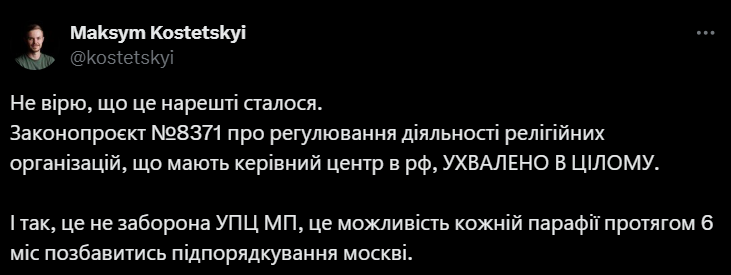 В сети были изрядно обрадовались новости о запрете связей с РПЦ, ведь этот законопроект зарегистрировали в Раде еще в январе 2023 года – то есть полтора года назад. До первого чтении он дошел только в октябре 2023 года. И уже в августе 2024 года в нем поставили точку.
