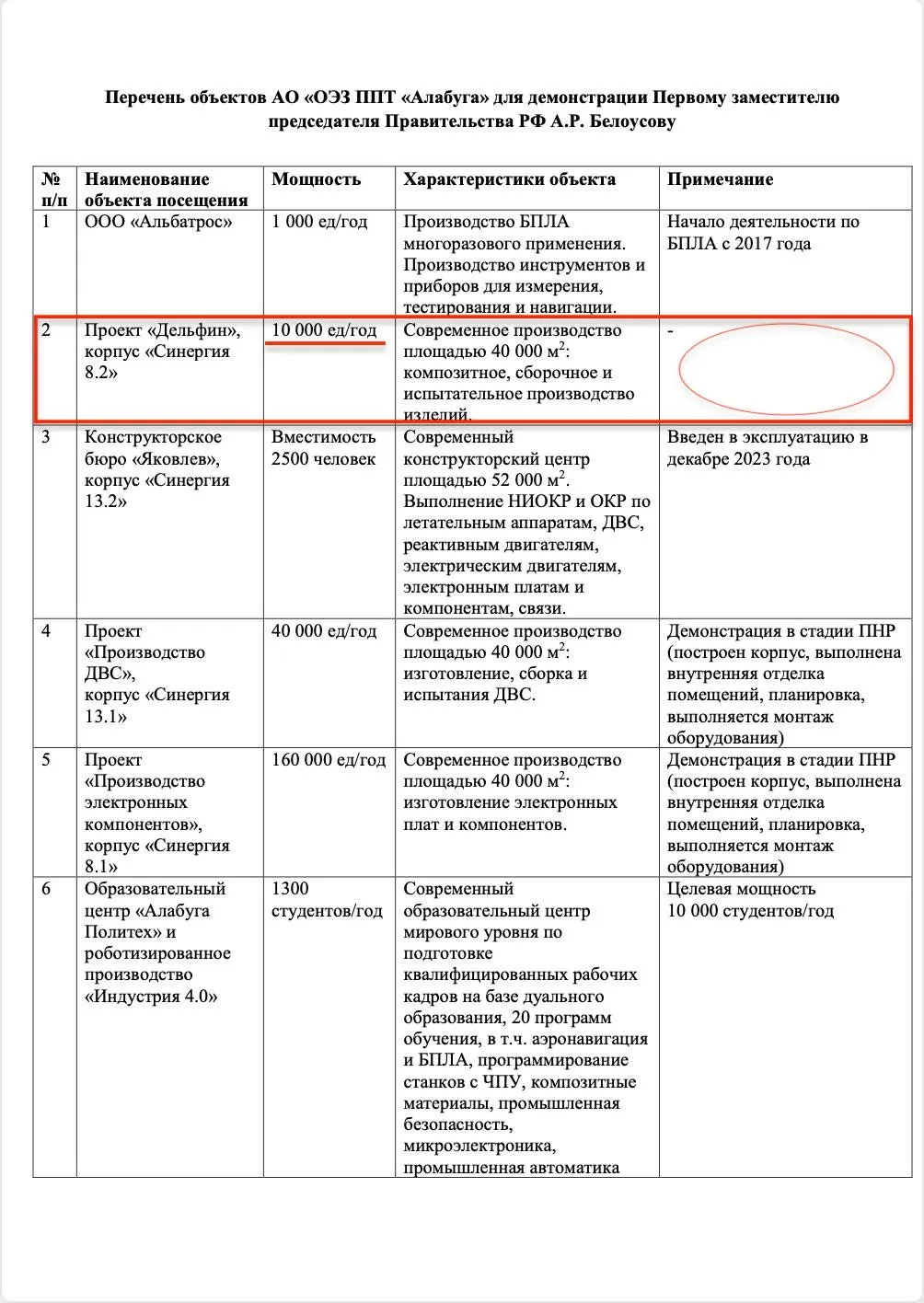 Так, в марте 2024 года в "Алабугу" планировался визит первого заместителя председателя правительства России Андрея Белоусова, который по совместительству выполняет еще и функции председателя Правительственной комиссии по вопросам развития беспилотных авиационных систем.