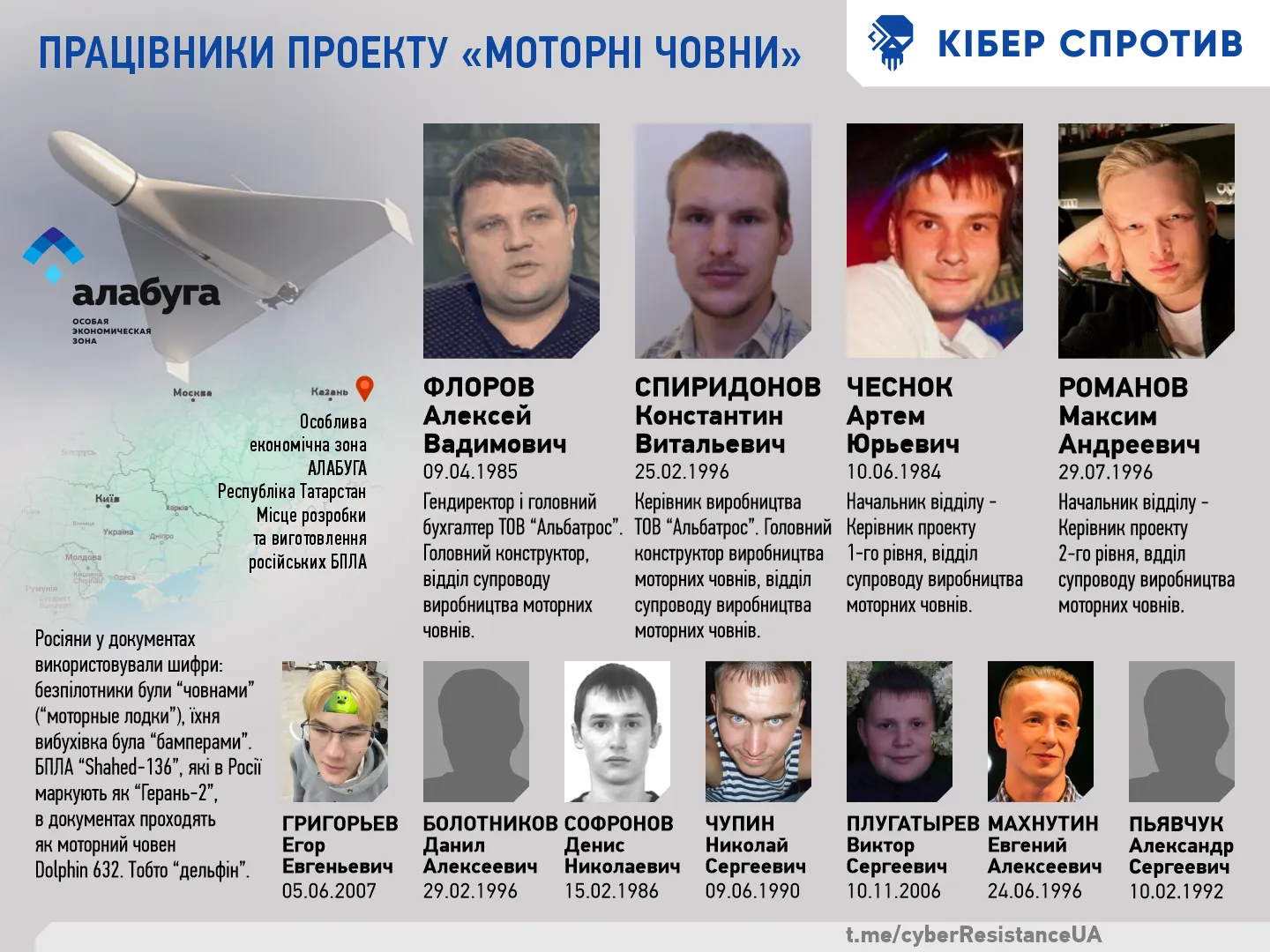 Еще в 2022 году издание The Washington Post писало, что в этой экономической зоне планируется изготовление иранских дронов. Важно, что в январе 2023 года РБК Татарстан опубликовали новость, что в "Алабуге" будут выпускать беспилотники и моторные лодки. Из слитых данных стало известно, что оккупанты используют шифрованные названия в документах – дрон "Шахед" там маркируют как моторную лодку Dolphin 632.