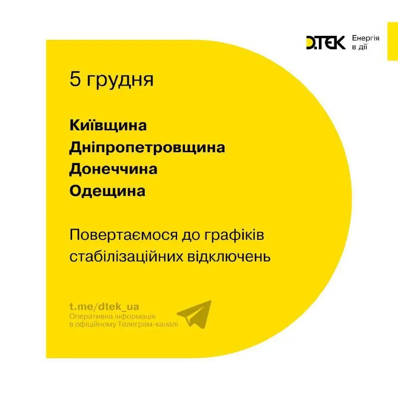 В ДТЭК отметили, что с 5 декабря в 4 областях возвращаются к графикам стабилизационных отключений. Речь идет о: