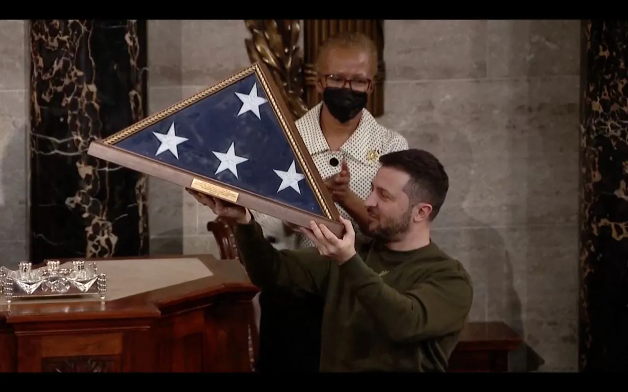 Зеленскому вручили флаг США, который сегодня развевался над Капитолием в честь его визита.