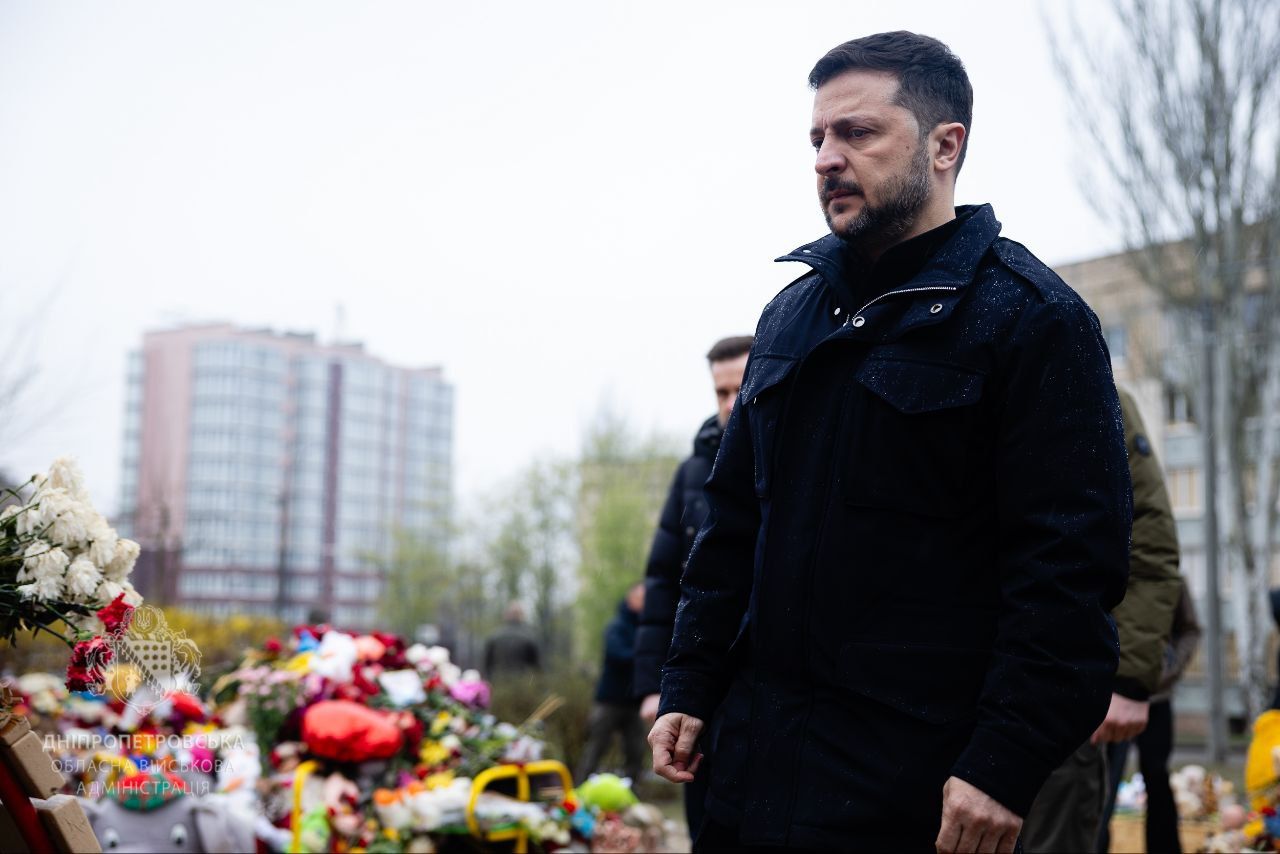 Украинский президент совместно с руководителем ОВА Сергеем Лисаком приехали на место ракетной атаки и в память о погибших зажгли лампадки и принесли игрушки. Вместе они осмотрели объем повреждений на месте удара.