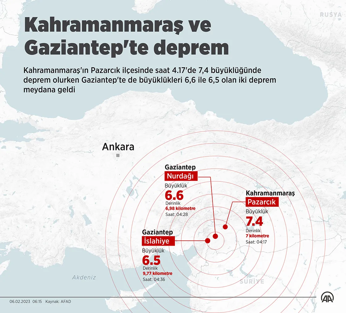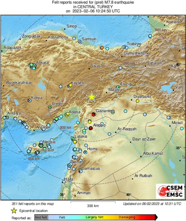 По данным EMSC, землетрясение с магнитудой 5,9 произошло в 77 километрах от города Кахраманмараш, где уже были толчки ночью. Впоследствии EMSC оценило новое землетрясение в 7,8 магнитуды.