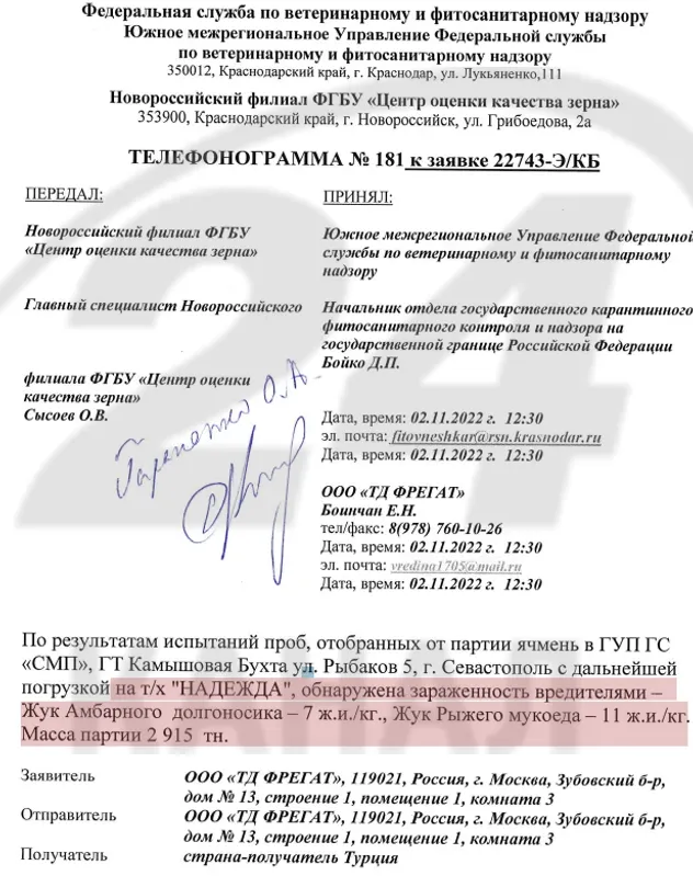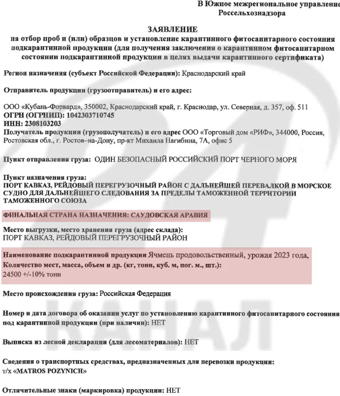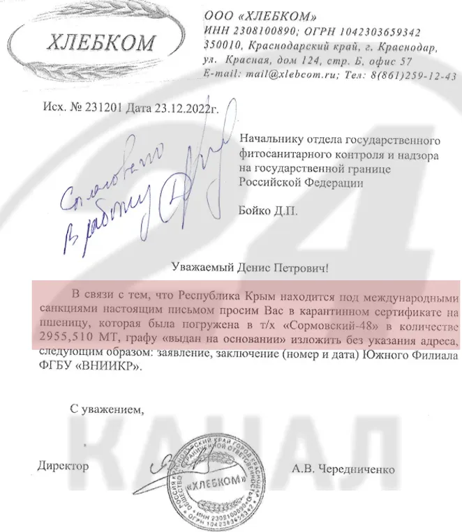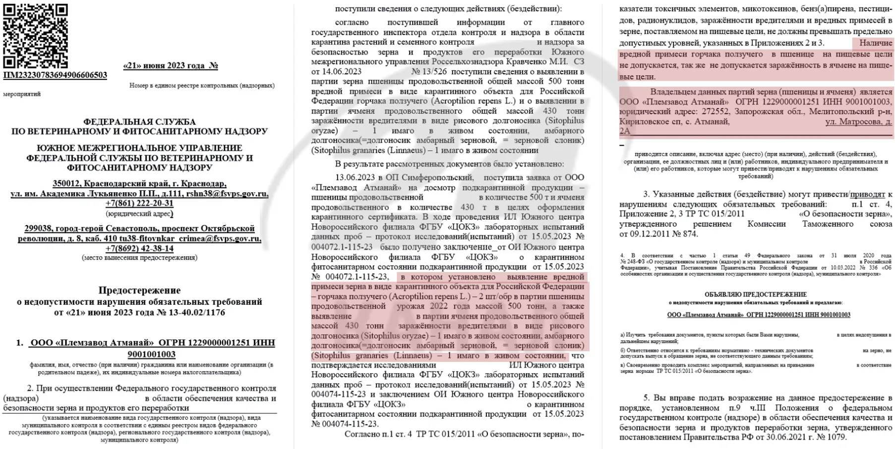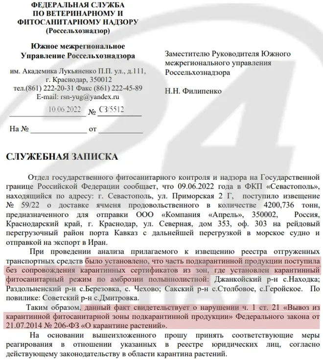 При этом во внутренних документах россельхознадзора чиновники указывают, что та или иная компания, которая якобы поставила в порт "зерно из Краснодара", нарушила нормы и привезла продукцию без обязательных бумаг.