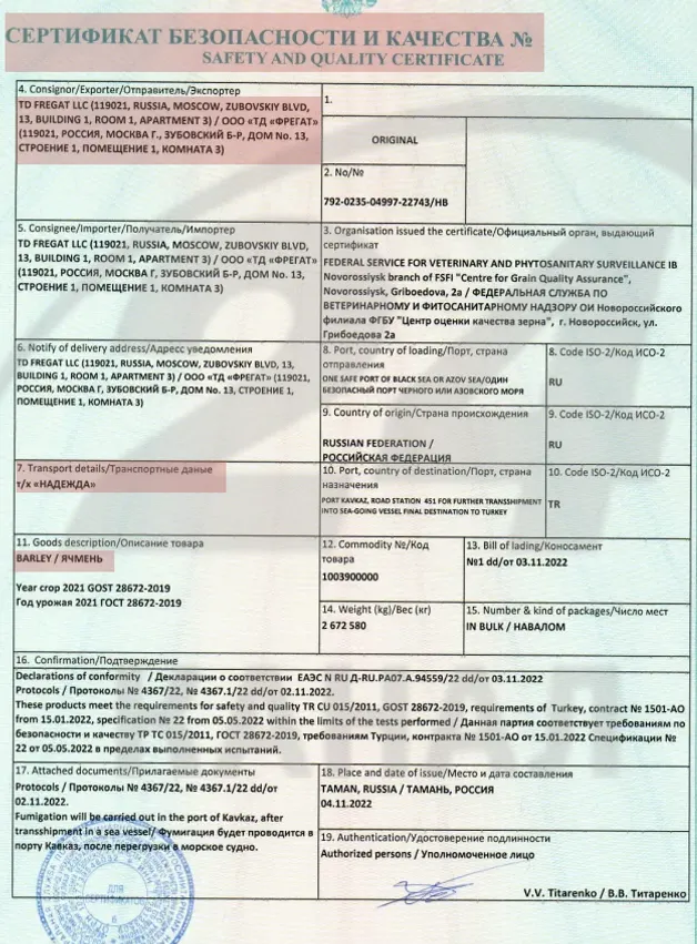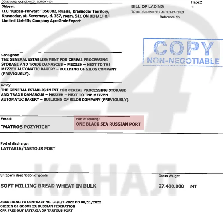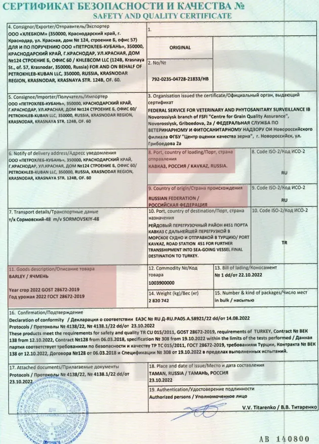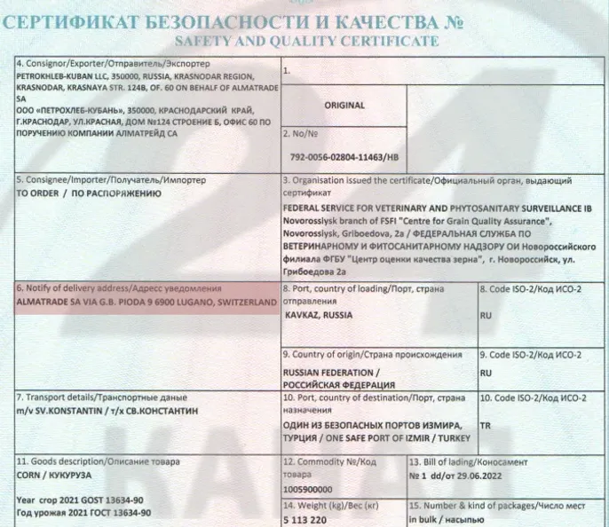 Тщательно подходят россияне и к попыткам скрыть факт торговли краденым зерном в международных документах. Во всех коносаментах, фитосанитарных сертификатах и других бумагах захватчики не просто указывают страной происхождения Россию, а иногда даже утверждают, что зерно было выращено где-то на Кубани. При этом скрывая место загрузки продукции под формулировкой "один из безопасных портов Черного или Азовского моря" или "один из портов Черного моря".
