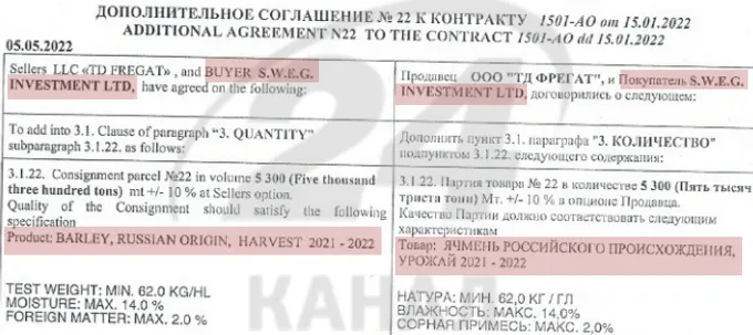 Согласно дополнению к заключенному 15 января 2022 года контракту, приобрела украинский ячмень компания из Никосии S.W.E.G. INVESTMENT LTD.