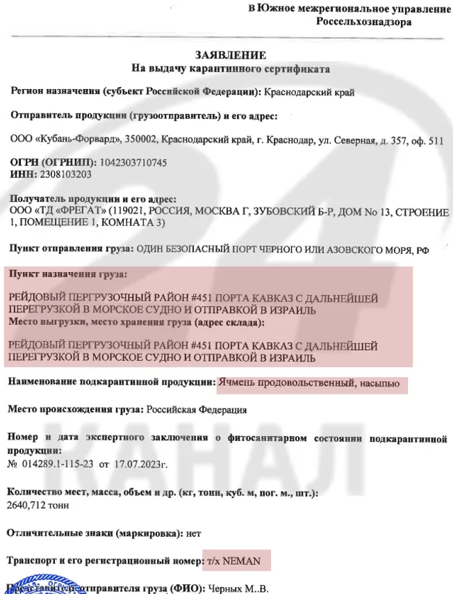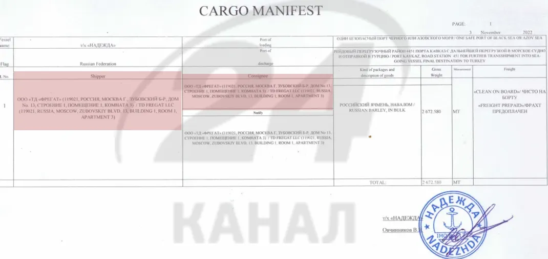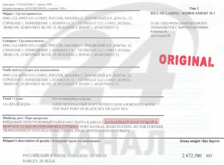 Когда продукция попадает в порт, ее оформляют не как принадлежащую какой-то фирме с оккупированных территорий, а как ту, чьими владельцами является компания с материковой России. Чаще всего фигурируют фирмы из Краснодарского края. Реже – из Москвы или других регионов. В нашем случае с ячменем речь идет как раз о столичной фирме "Торговый дом Фрегат", зарегистрированной на бульваре Зубовском, дом 13, здание 1, помещение 1, кабинет 3.