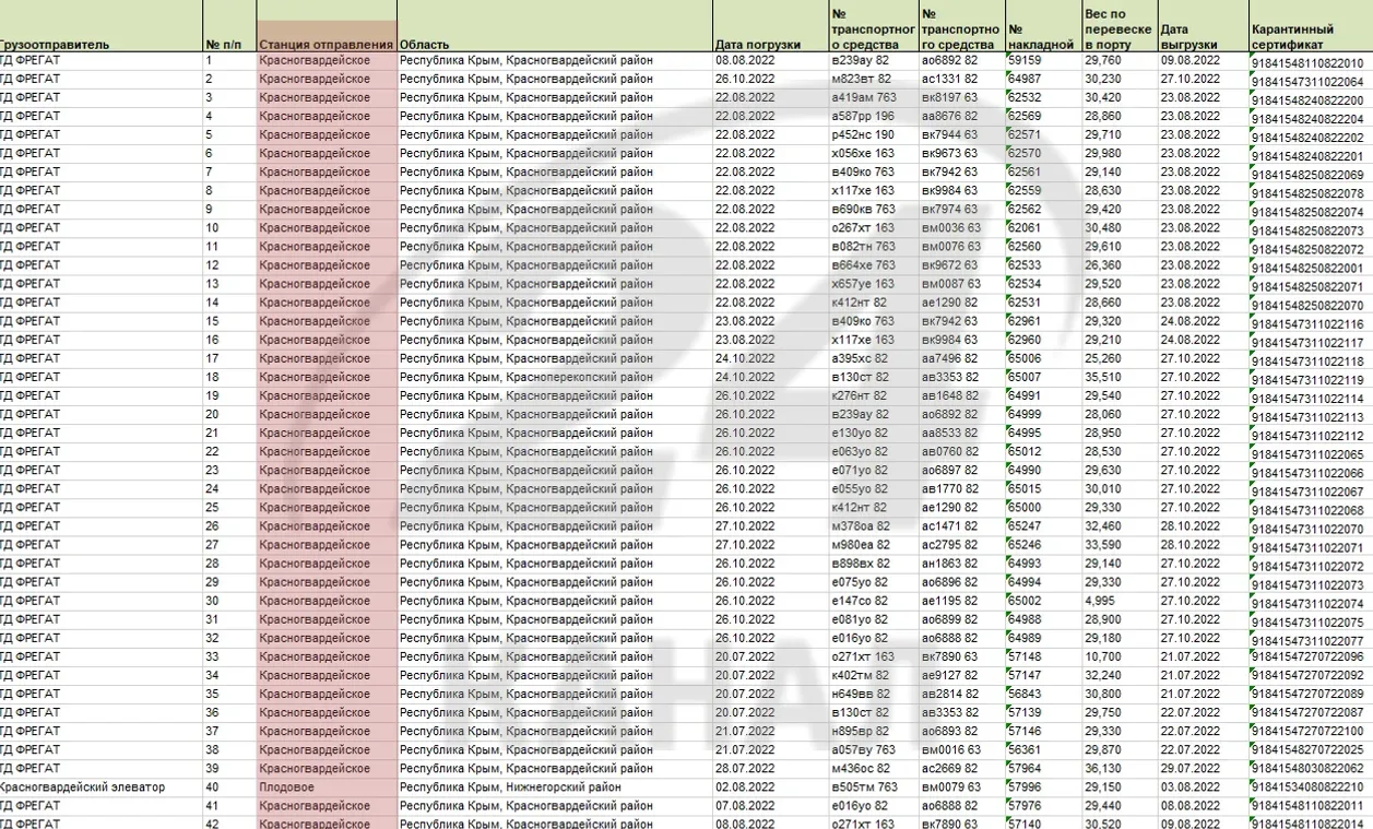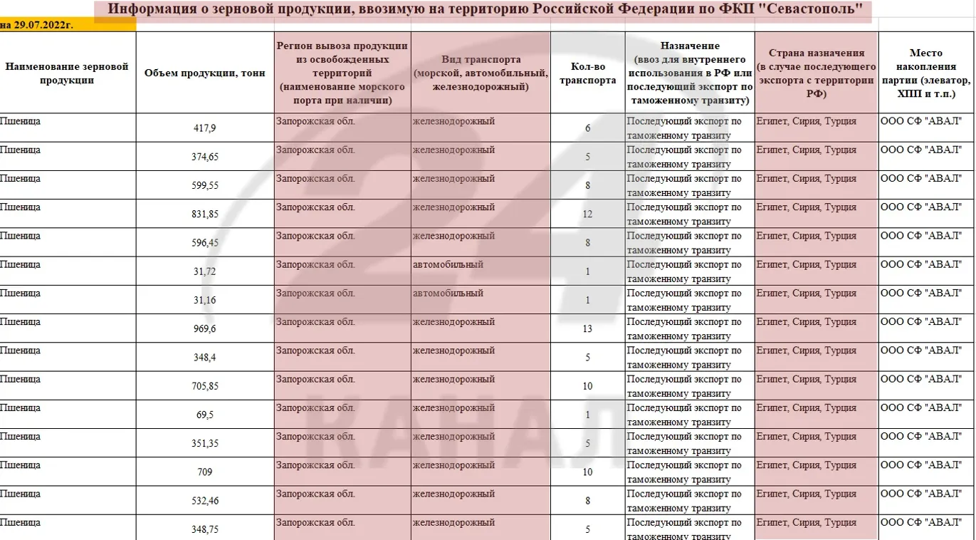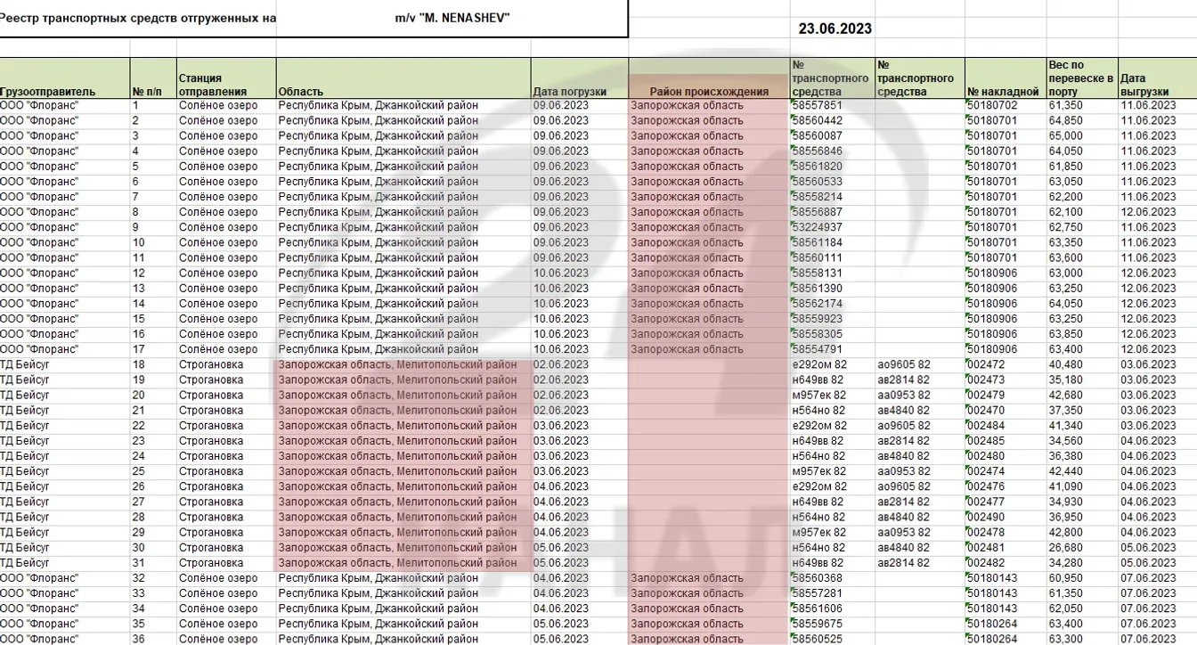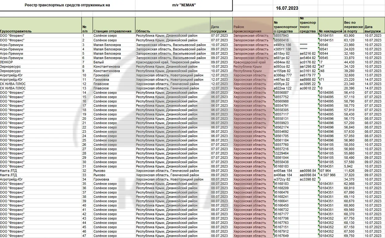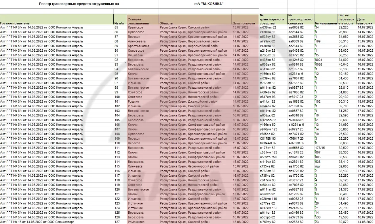 Также в реестрах, где указано, с каких зерновозов загружали урожай на тот или иной корабль, есть немало свидетельств о том, что продукцию завозили именно с новооккупированных территорий.