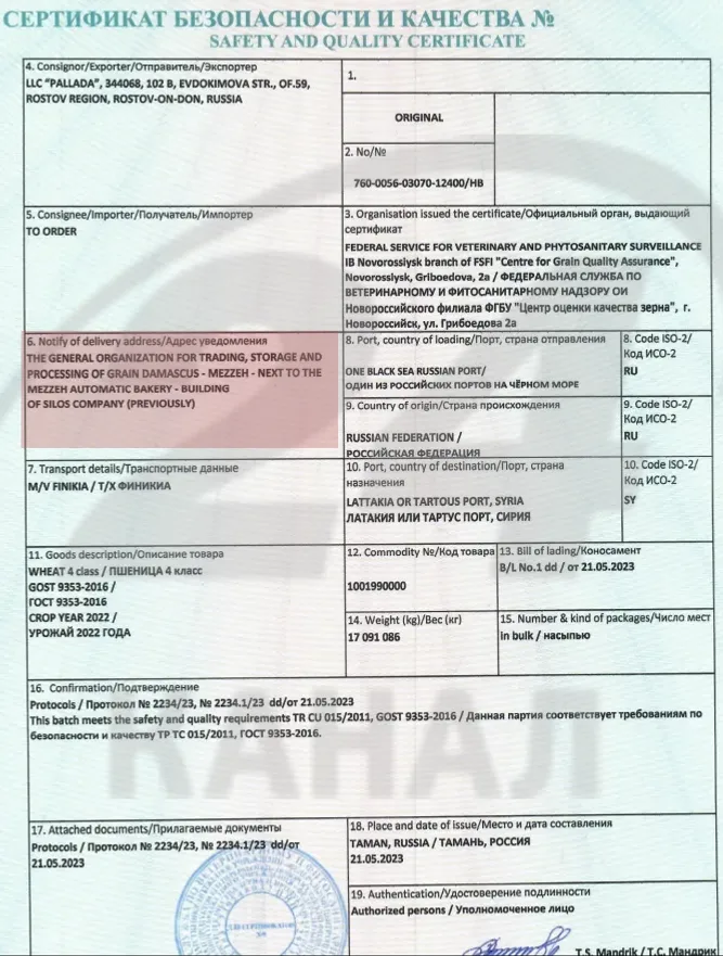 Отправитель – компания "Паллада", получатель – государственная сирийская General Organization for Trade, Storage and Grain Processing
