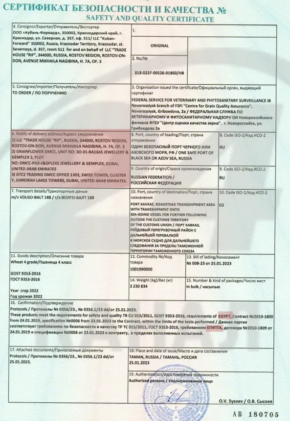 Скорее всего, в случае с вывозом 3,230 тысячи тонн пшеницы судном VOLGO-BALT 188, непосредственные контракты на поставку зерна в Египет заключали уже иностранные компании – чтобы Египет впоследствии мог говорить, что это же он не у россиян ворованное украинское покупал.