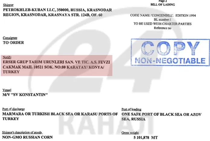 Тогда, в июле 2022, коносамент был оформлен на турецкую Erser Grup Tarım Ürünleri San. ve Tic. A.Ş.
