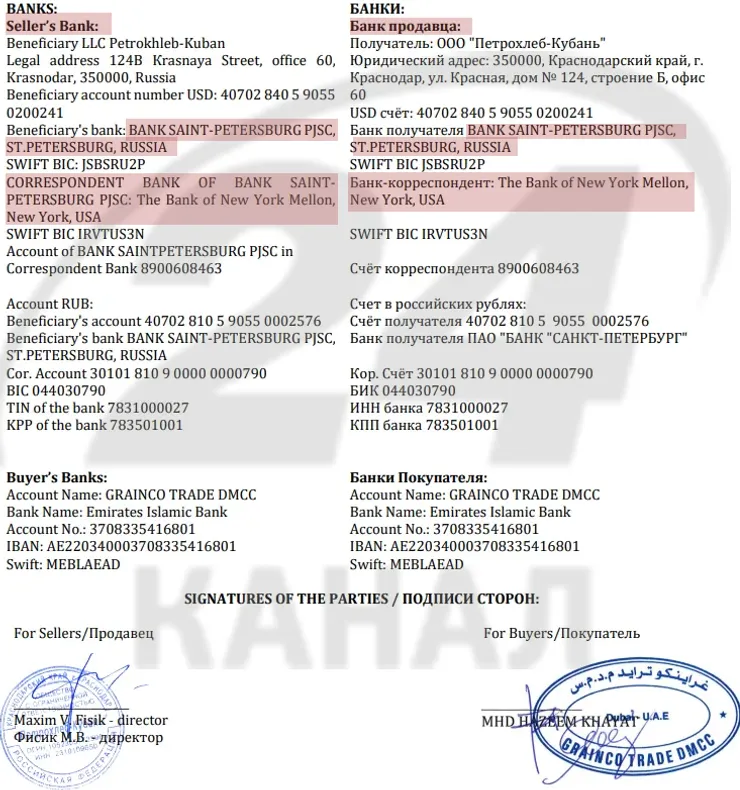 Счет, на который оплатили арабы, принадлежит ПАО "Банк "Санкт-Петербург", который является одним из тех, что обслуживает российские оборонные заказы. Банком-корреспондентом, через который, вероятно, провели платеж, должен был служить The Bank of New York Mellon. И хотя российская финансовая структура попала под санкции только 24 февраля 2023 года, получается, что американцы в разгар войны могли провести платеж на счета преступников за поставки краденой кукурузы в Сирию.