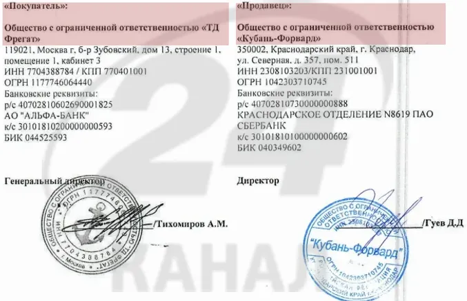 Отправитель – "Кубань-Форвард", владельцы/получатели – российская ТД "Риф", а также 2 компании из Дубая: GTCS Trading DMCC и Grainflower DMCC / Фото источников 24 Канала