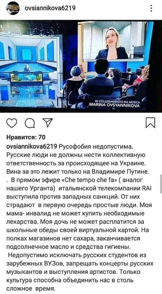 Женщина стала известна после акции протеста против войны. Пользуясь своей популярностью, начала в эфире европейских СМИ пропагандировать отмену санкций против России. Ведь, по ее словам, простые смертные россияне не должны терпеть их, только Путин.