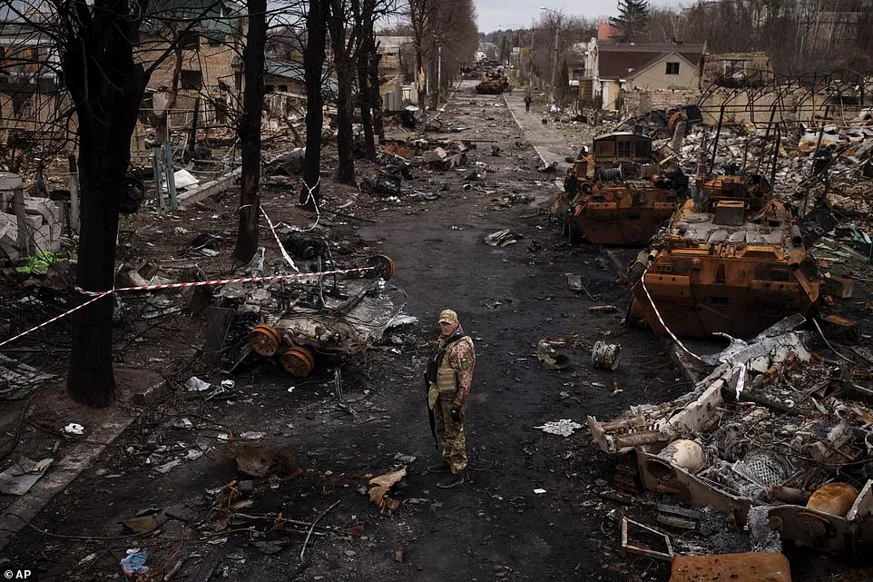Улица Вокзальная в Буче, где ВСУ уничтожили российскую военную технику, 6 апреля 2022 года / Фото АР
