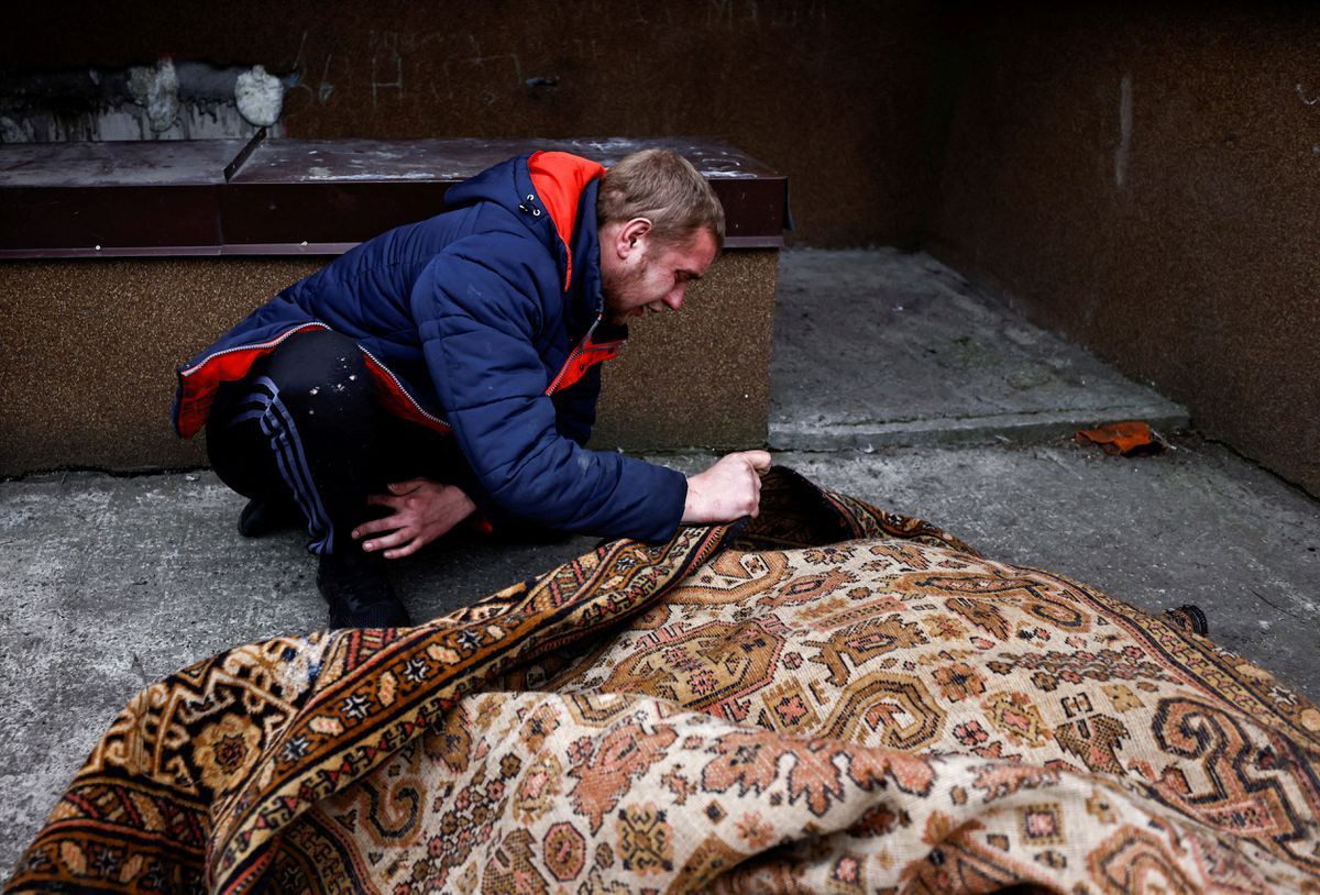 В этом ковре было тело 30-летнего Игоря Литвиненко. Один из мужчин, который его прячет – друг Сергей Лаговский. Женщина рядом – Людмила Вергинская, мама другого погибшего, он похоронен неподалеку. Через почти год от создания фото рассказываем его историю и историю погибшего Игоря Литвиненко