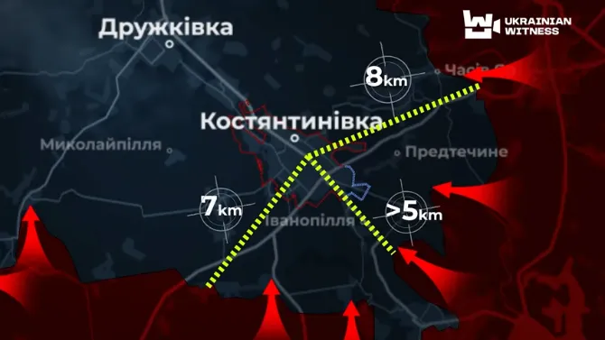 Відрізати логістичні шляхи, захопити Костянтинівку та просунутися далі, зокрема на Краматорськ – такі цілі, за словами військових, переслідує армія Росії на Костянтинівському напрямку. Окупанти тиснуть з трьох сторін. За даними DeepState – найближче вони за 5 кілометрів від міста. З власних джерел знімальній групі стало відомо, що є навіть випадки просочування росіян у центр Костянтинівки,