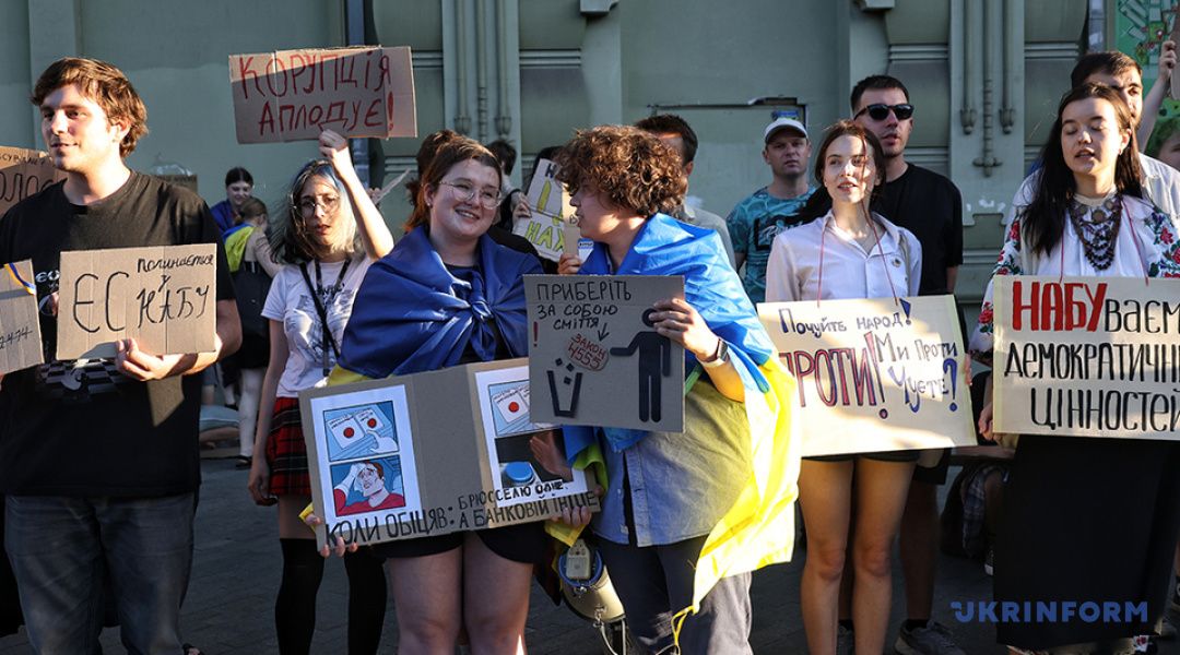 30 липня, в центрі Києва біля театру імені Івана Франка зібралися кілька сотень мітингувальників. Вони закликають депутатів підтримати президентський законопроєкт №13533, який має відновити незалежність антикорупційної інфраструктури, обмеженої раніше ухваленим законом №12414.