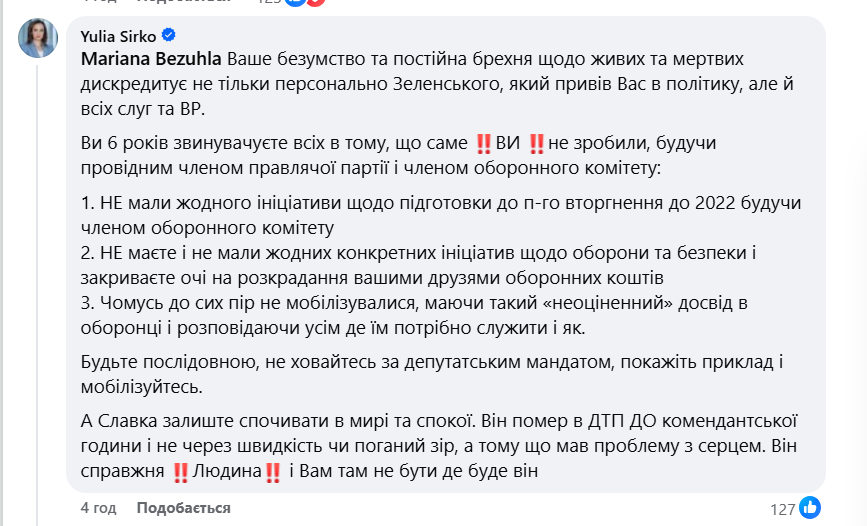 Нардепка Юлія Сірко від "Голосу" своєю чергою заявила, що Безугла звинувачує усіх у тому, чого за 6 років сама не зробила, будучи провідним членом правлячої партії і членом оборонного комітету.