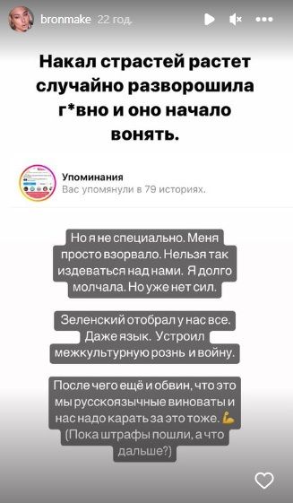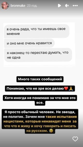 Також Руслана Броннікова публікувала сторіз, у яких писала про свої погляди. Зокрема, що нібито: