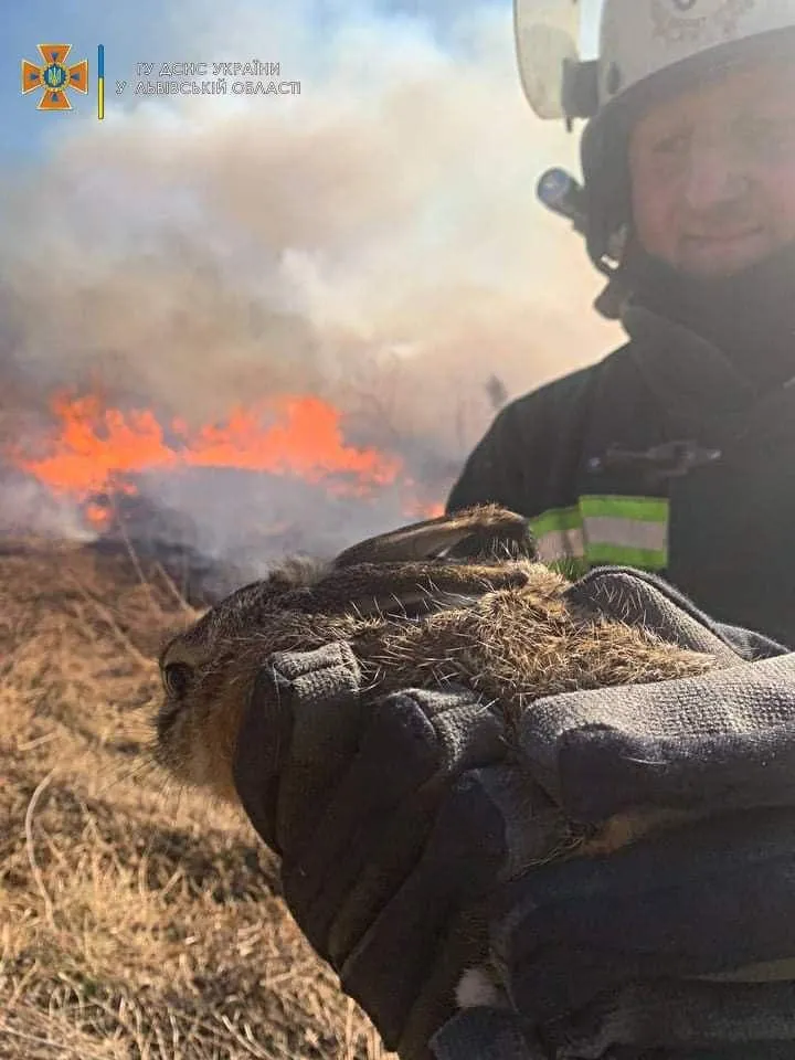 Працівники ДСНС опублікували фото врятованого зайченяти та попросили українців залишатися людьми – не спалювати суху траву та життя.