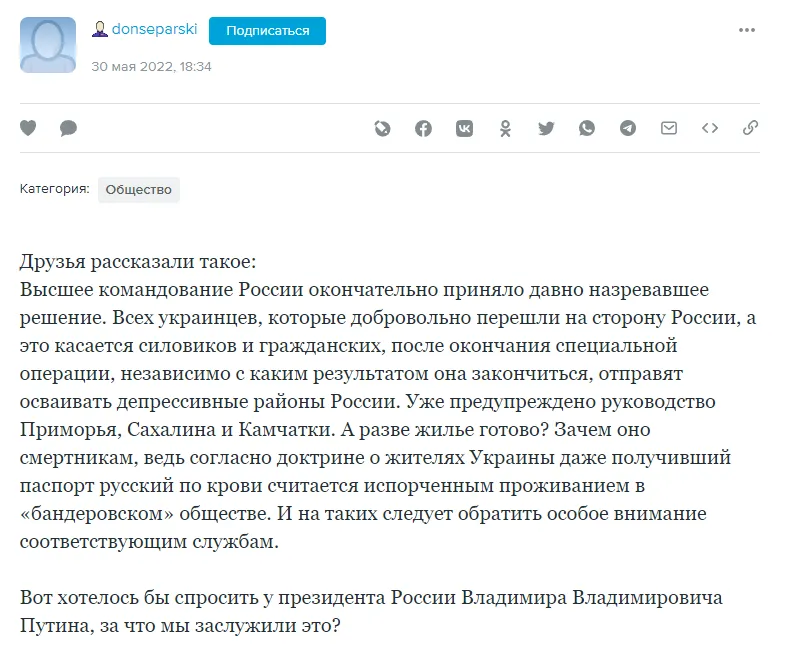 Розмови про майбутнє примусове переселення вже дійшли до проросійських терористів. Нікому з них не подобається перспектива опинитися десь у занедбаному російському селі. Адепти "русского міра" скаржаться на те, що Путін їх зрадив. Мовляв, за службу на боці Росії ніхто з вищого політичного командування країни-агресорки нагороджує їх не покращенням життя на Донбасі, а відрядженням до занедбаних міст та селищ. Крім того, деякі бойовики обговорюють й прийняту Росією доктрину про ставлення до жителів окупованих територій як до "зіпсованих проживанням у бандерівському суспільстві". Тобто як до людей другого сорту.