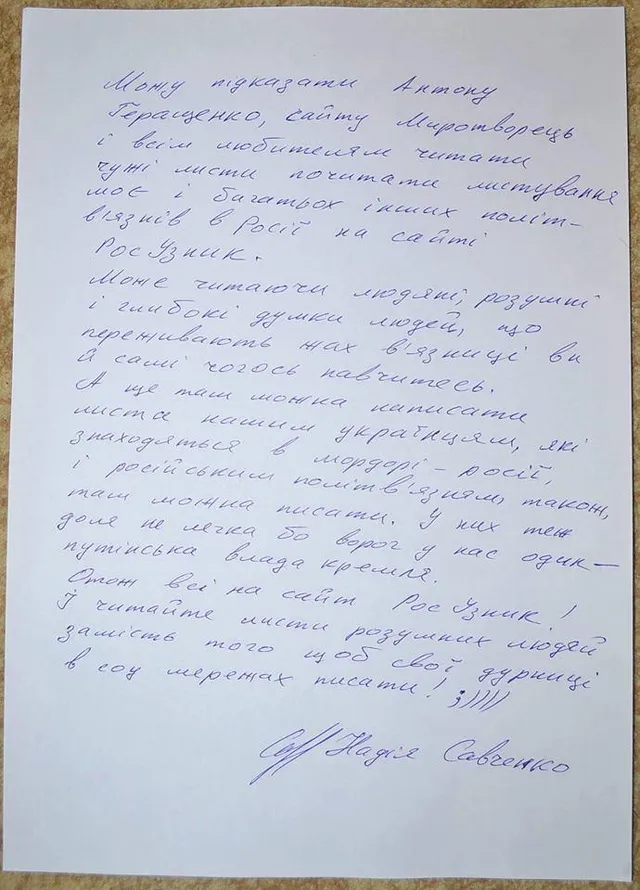 "Можу підказати Антону Геращенку, сайту Миротворець і всім любителям читати чужі листи почитати листування моє і багатьох інших політвязнів у Росії на сайті РосУзник", – зазначила Савченко.