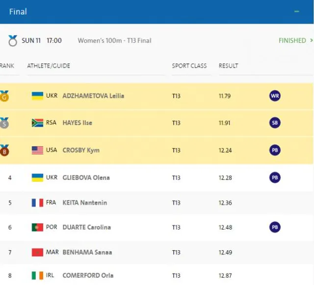 Також 22-річна харків’янка Лейла Аджаметова завоювала золото у бігу на 100 метрів. Варто відзначити, що українка встановила світовий рекорд, пробігши дистанцію за 11,79 секунд.