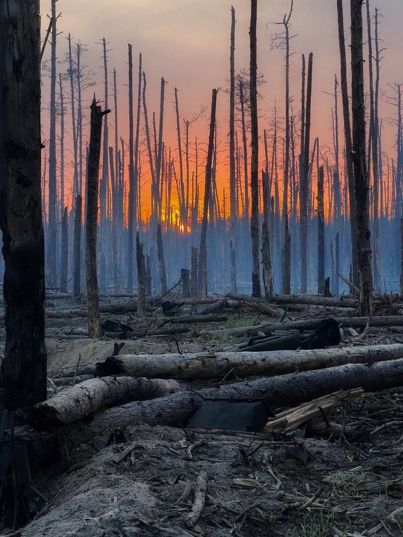 Світанок у Серебрянському лісі зафіксував Антон Стукало, а опублікував в мережі боєць бригади "Буревій" Національної гвардії України Денис Зелений. На кадрах можна побачити, що окупанти абсолютно випалили дерева у лісі, не залишивши там нічого живого.