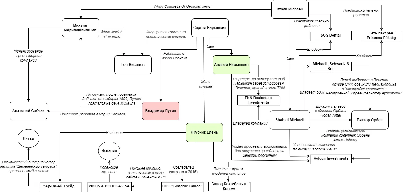 У цій схемі задіяні 10 осіб: Путін, Орбан, Наришкін-старший, покійний Собчак, Наришкін-молодший, Michaeli Itzhak, Michael Shabtai, Якубчик, Год Нісанов, Miriashvili Michael-ІІ / Molfarel-ІІ