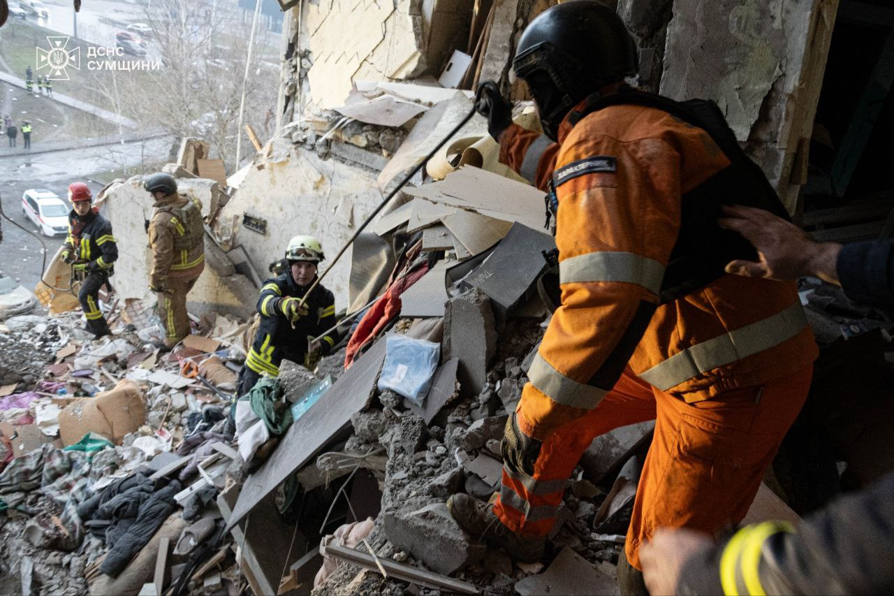 Наслідки удару "Шахеда" по багатоповерхівці у Сумах / Фото ДСНС