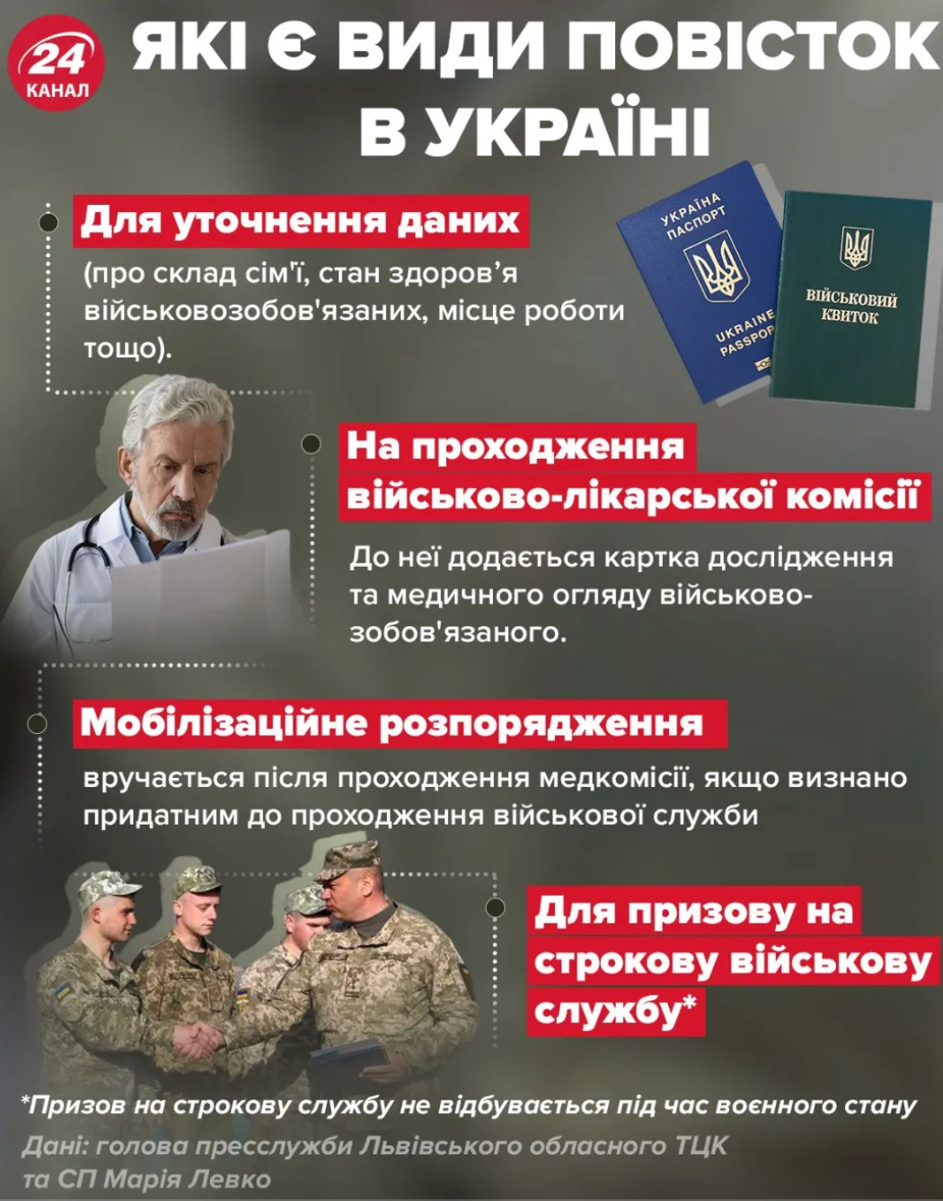 В Україні є 4 види повісток, – для уточнення даних, на проходження військово-лікарської комісії, для призову на строкову військову службу, мобілізаційне розпорядження (бойова повістка).