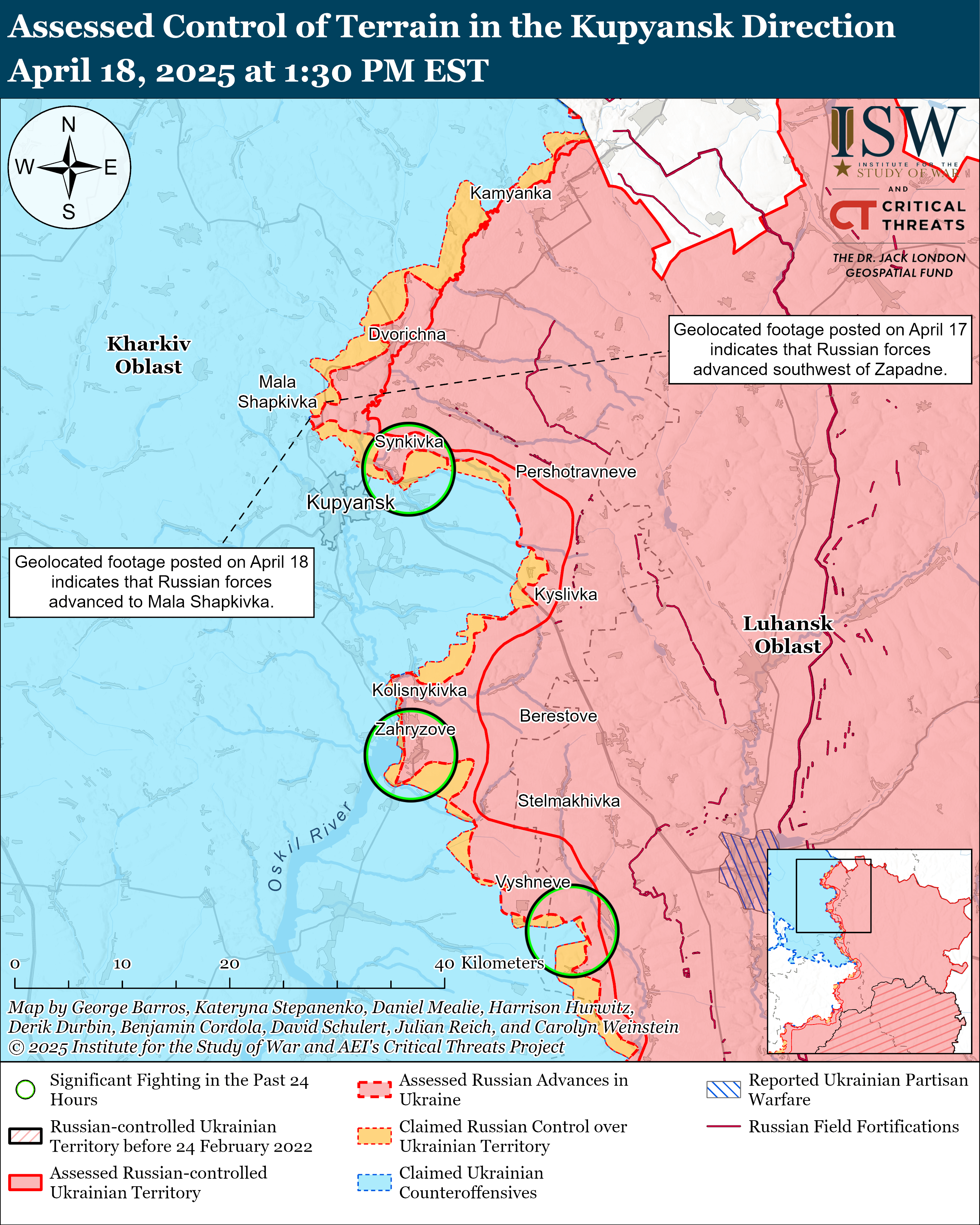 - Російські війська просунулися на Куп'янському напрямку. Геолокаційні кадри від 17 і 18 квітня вказують, що окупанти пройшли поблизу траси Р-79 Куп'янськ – Дворічна на південний захід від Західного, що на північ від Куп’янська, та до східної околиці Малої Шапківки, що на північний захід від Куп’янська.
