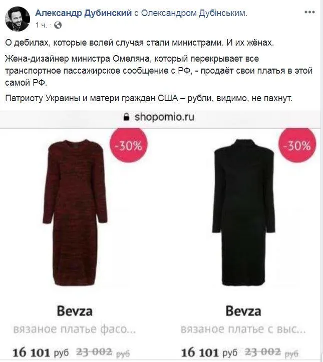Одружений з дизайнеркою Світланою Бевзою, її звинувачували у продажі суконь у Росію. Про це заявляв журналіст Дубинський на своїй сторінці в ФБ. Він показав скріни виставлених на продаж Світланою Бевзою суконь її бренду Bevza на російському інтернет-порталі одягу і взуття Shopomio.