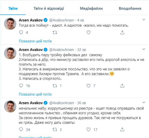 Аваков вважає, що директор Ситник шукає "привід для виправдання своїх корупційних дій, звинувачуючи інших". Глава МВС у своєму твітері перейшов на особистості, вживаючи зокрема слова "дурень" та "ідіот".