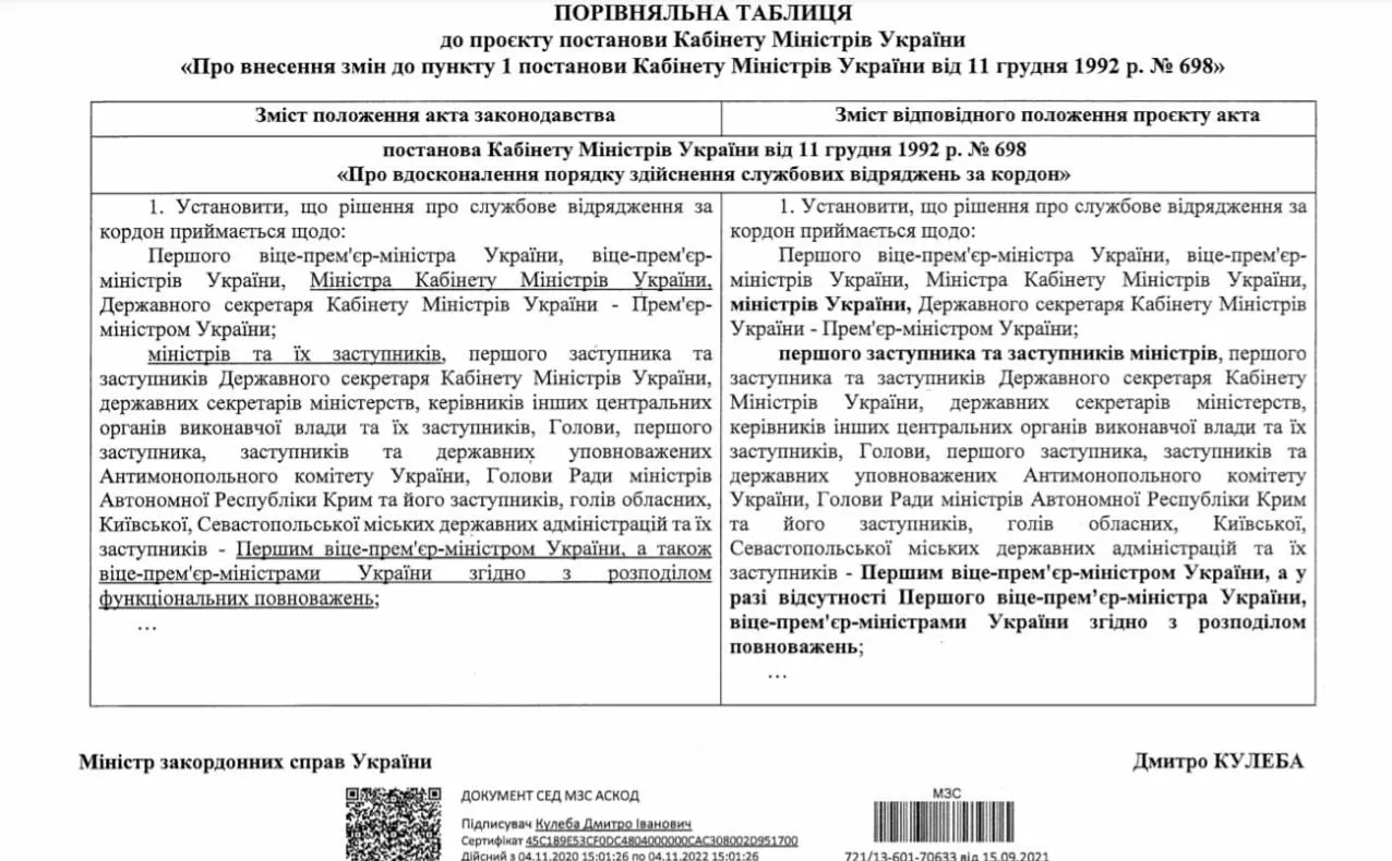 Проєктом акта передбачається погодження прем'єр-міністром України закордонних відряджень міністрів,
