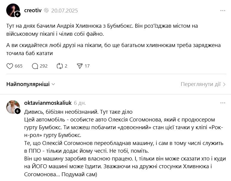 Інші користувачі засудили допис та стали на захист Андрія Хливнюка. Вони нагадали, що лідер "Бумбоксу" неодноразово був на передовій, а пікап, в якому він їхав, насправді не військовий.