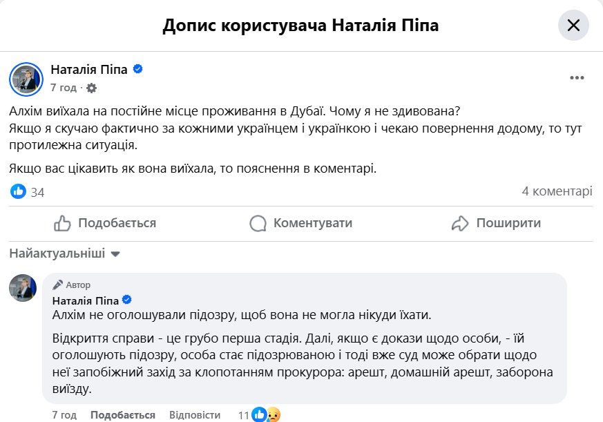 Днями Анна Алхім повідомила, що переїжджає жити в Дубай й зазначила, що поки не планує повертатися. Народна депутатка Наталія Піпа пояснила, як блогерка змогла виїхати з України після відкриття кримінальних справ.